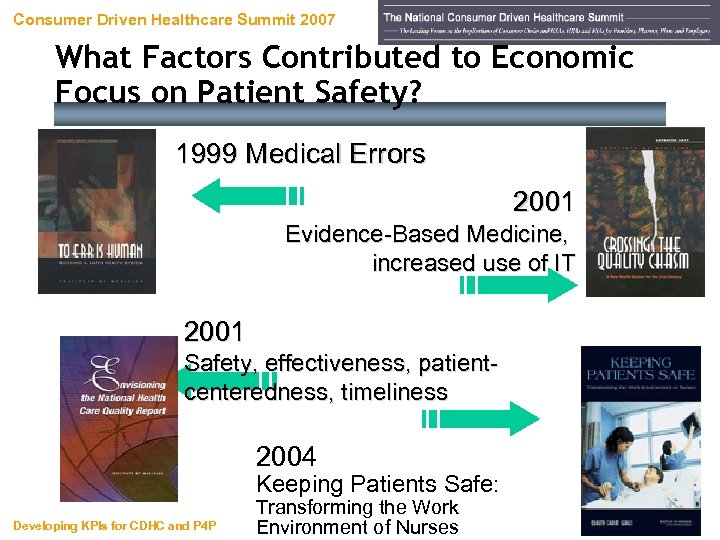 Consumer Driven Healthcare Summit 2007 What Factors Contributed to Economic Focus on Patient Safety? 1999 Medical Errors 2001 Evidence-Based Medicine, increased use of IT 2001 Safety, effectiveness, patientcenteredness, timeliness 2004 Keeping Patients Safe: Developing KPIs for CDHC and P 4 P Transforming the Work Environment of Nurses 41