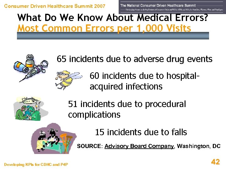 Consumer Driven Healthcare Summit 2007 What Do We Know About Medical Errors? Most Common Errors per 1, 000 Visits 65 incidents due to adverse drug events 60 incidents due to hospitalacquired infections 51 incidents due to procedural complications 15 incidents due to falls SOURCE: Advisory Board Company, Washington, DC Developing KPIs for CDHC and P 4 P 42