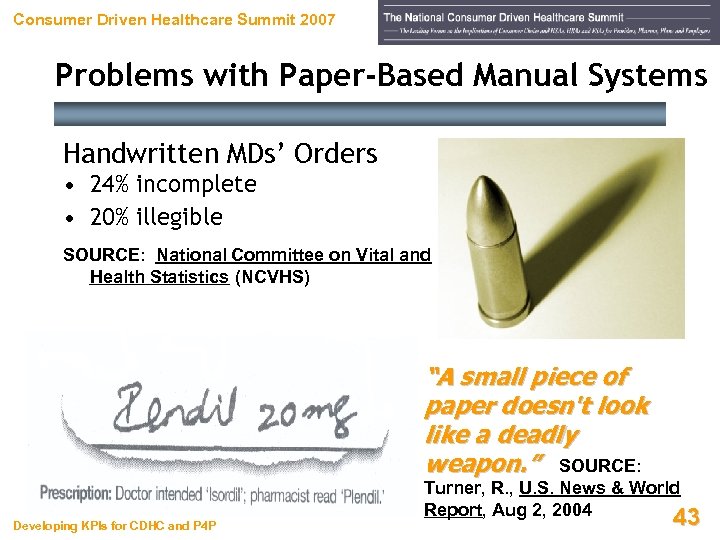 Consumer Driven Healthcare Summit 2007 Problems with Paper-Based Manual Systems Handwritten MDs’ Orders • 24% incomplete • 20% illegible SOURCE: National Committee on Vital and Health Statistics (NCVHS) “A small piece of paper doesn't look like a deadly weapon. ” SOURCE: Developing KPIs for CDHC and P 4 P Turner, R. , U. S. News & World Report, Aug 2, 2004 43