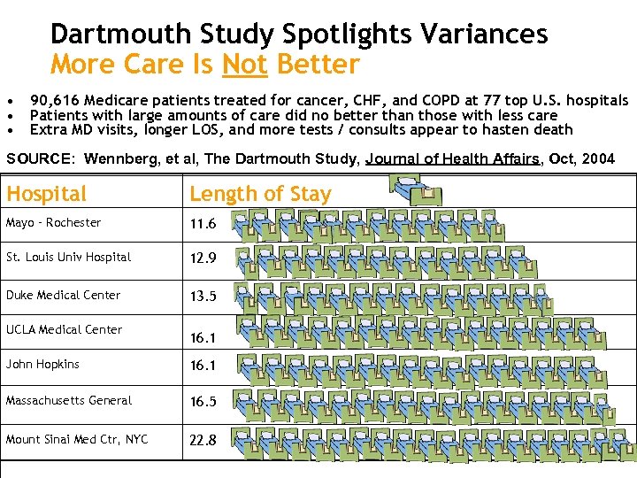 Dartmouth Study Spotlights Variances More Care Is Not Better • • • 90, 616 Medicare patients treated for cancer, CHF, and COPD at 77 top U. S. hospitals Patients with large amounts of care did no better than those with less care Extra MD visits, longer LOS, and more tests / consults appear to hasten death SOURCE: Wennberg, et al, The Dartmouth Study, Journal of Health Affairs, Oct, 2004 Hospital Length of Stay Mayo – Rochester 11. 6 St. Louis Univ Hospital 12. 9 Duke Medical Center 13. 5 UCLA Medical Center 16. 1 John Hopkins 16. 1 Massachusetts General 16. 5 Mount Sinai Med Ctr, NYC 22. 8