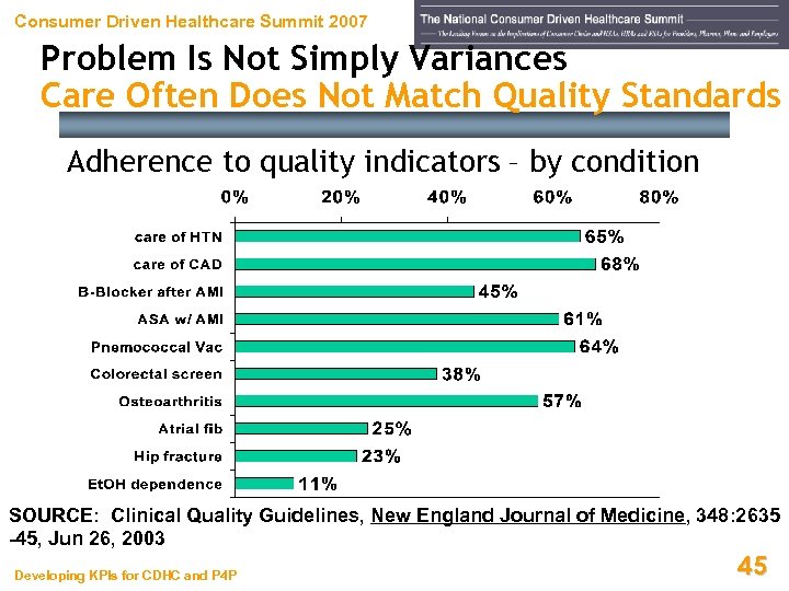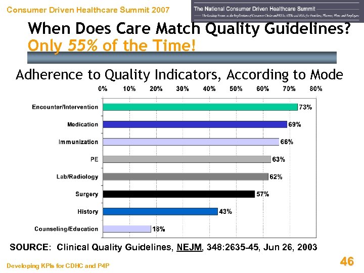 Consumer Driven Healthcare Summit 2007 Problem Is Not Simply Variances Care Often Does Not Match Quality Standards Adherence to quality indicators – by condition SOURCE: Clinical Quality Guidelines, New England Journal of Medicine, 348: 2635 -45, Jun 26, 2003 Developing KPIs for CDHC and P 4 P 45