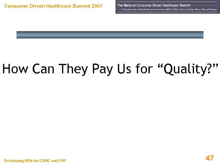 Consumer Driven Healthcare Summit 2007 How Can They Pay Us for “Quality? ” Developing KPIs for CDHC and P 4 P 47