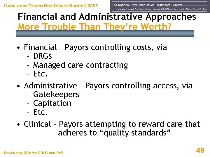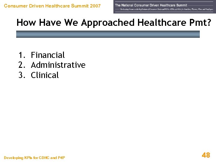 Consumer Driven Healthcare Summit 2007 How Have We Approached Healthcare Pmt? 1. Financial 2. Administrative 3. Clinical Developing KPIs for CDHC and P 4 P 48