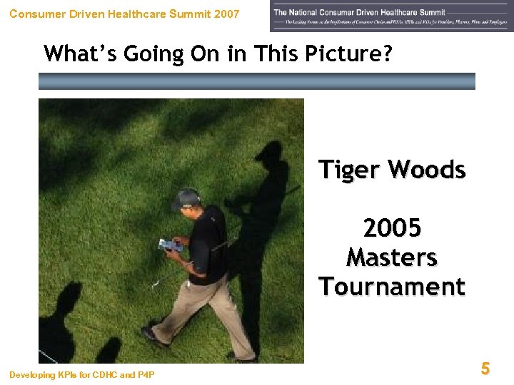 Consumer Driven Healthcare Summit 2007 What’s Going On in This Picture? Tiger Woods 2005 Masters Tournament Developing KPIs for CDHC and P 4 P 5