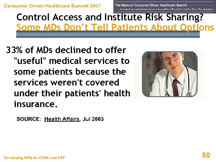 Consumer Driven Healthcare Summit 2007 Control Access and Institute Risk Sharing? Some MDs Don’t Tell Patients About Options 33% of MDs declined to offer "useful" medical services to some patients because the services weren't covered under their patients' health insurance. SOURCE: Health Affairs, Jul 2003 Developing KPIs for CDHC and P 4 P 50