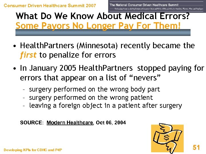 Consumer Driven Healthcare Summit 2007 What Do We Know About Medical Errors? Some Payors No Longer Pay For Them! • Health. Partners (Minnesota) recently became the first to penalize for errors • In January 2005 Health. Partners stopped paying for errors that appear on a list of “nevers” – surgery performed on the wrong body part – surgery performed on the wrong patient – leaving a foreign object in a patient after surgery SOURCE: Modern Healthcare, Oct 06, 2004 Developing KPIs for CDHC and P 4 P 51