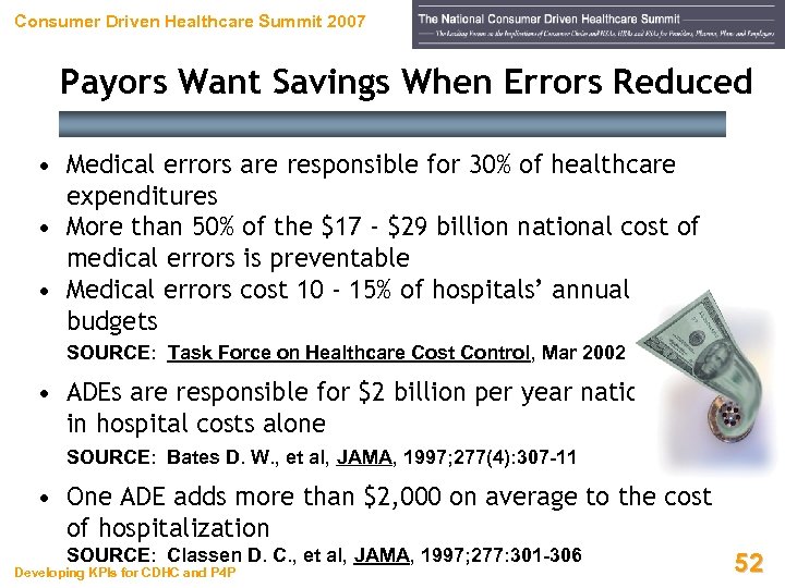 Consumer Driven Healthcare Summit 2007 Payors Want Savings When Errors Reduced • Medical errors are responsible for 30% of healthcare expenditures • More than 50% of the $17 - $29 billion national cost of medical errors is preventable • Medical errors cost 10 - 15% of hospitals’ annual budgets SOURCE: Task Force on Healthcare Cost Control, Mar 2002 • ADEs are responsible for $2 billion per year nationwide in hospital costs alone SOURCE: Bates D. W. , et al, JAMA, 1997; 277(4): 307 -11 • One ADE adds more than $2, 000 on average to the cost of hospitalization SOURCE: Classen D. C. , et al, JAMA, 1997; 277: 301 -306 Developing KPIs for CDHC and P 4 P 52