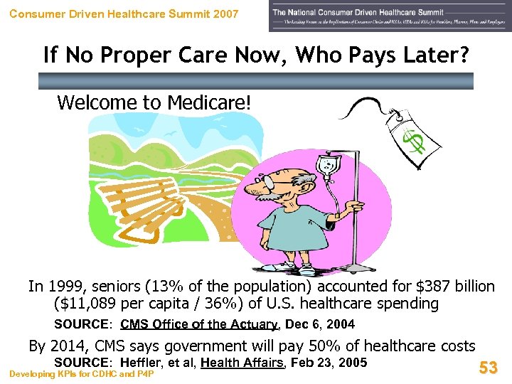 Consumer Driven Healthcare Summit 2007 If No Proper Care Now, Who Pays Later? Welcome to Medicare! In 1999, seniors (13% of the population) accounted for $387 billion ($11, 089 per capita / 36%) of U. S. healthcare spending • SOURCE: CMS Office of the Actuary, Dec 6, 2004 By 2014, CMS says government will pay 50% of healthcare costs SOURCE: Heffler, et al, Health Affairs, Feb 23, 2005 Developing KPIs for CDHC and P 4 P 53