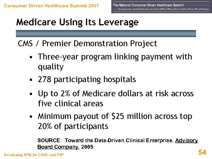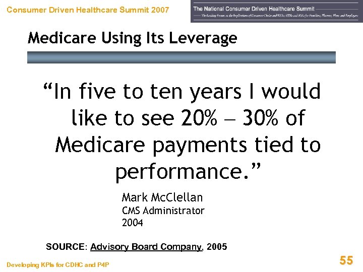 Consumer Driven Healthcare Summit 2007 Medicare Using Its Leverage CMS / Premier Demonstration Project • Three-year program linking payment with quality • 278 participating hospitals • Up to 2% of Medicare dollars at risk across five clinical areas • Minimum payout of $25 million across top 20% of participants SOURCE: Toward the Data-Driven Clinical Enterprise, Advisory Board Company, 2005 Developing KPIs for CDHC and P 4 P 54