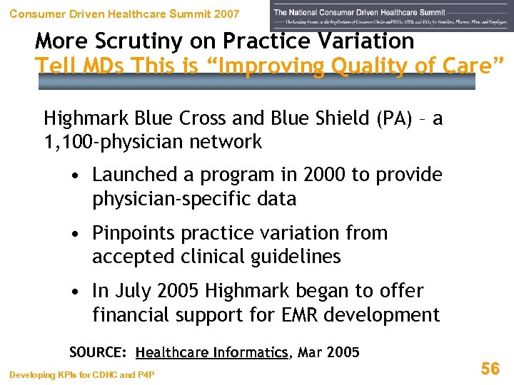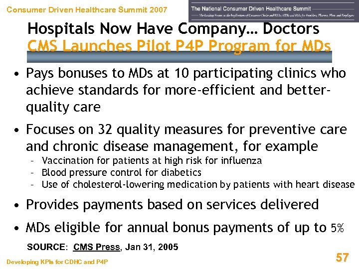 Consumer Driven Healthcare Summit 2007 More Scrutiny on Practice Variation Tell MDs This is “Improving Quality of Care” Highmark Blue Cross and Blue Shield (PA) – a 1, 100 -physician network • Launched a program in 2000 to provide physician-specific data • Pinpoints practice variation from accepted clinical guidelines • In July 2005 Highmark began to offer financial support for EMR development SOURCE: Healthcare Informatics, Mar 2005 Developing KPIs for CDHC and P 4 P 56