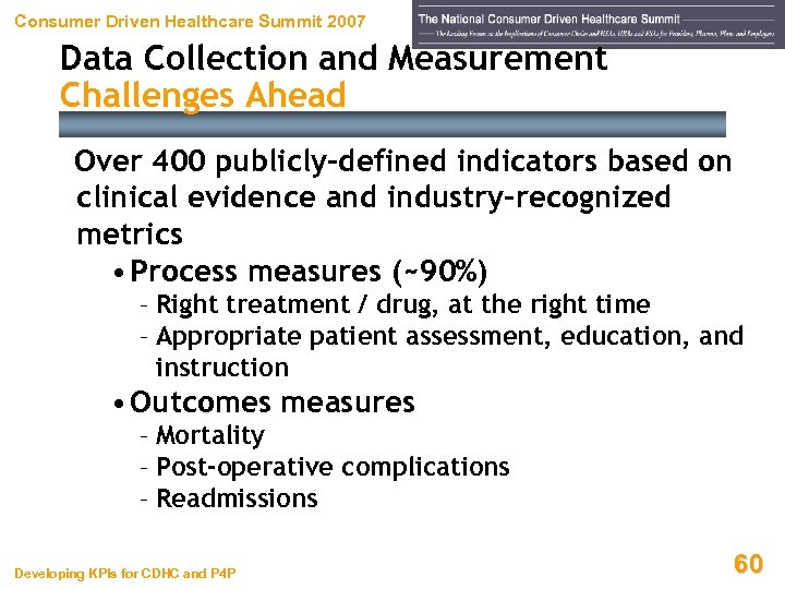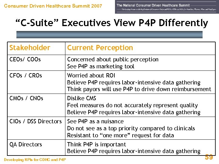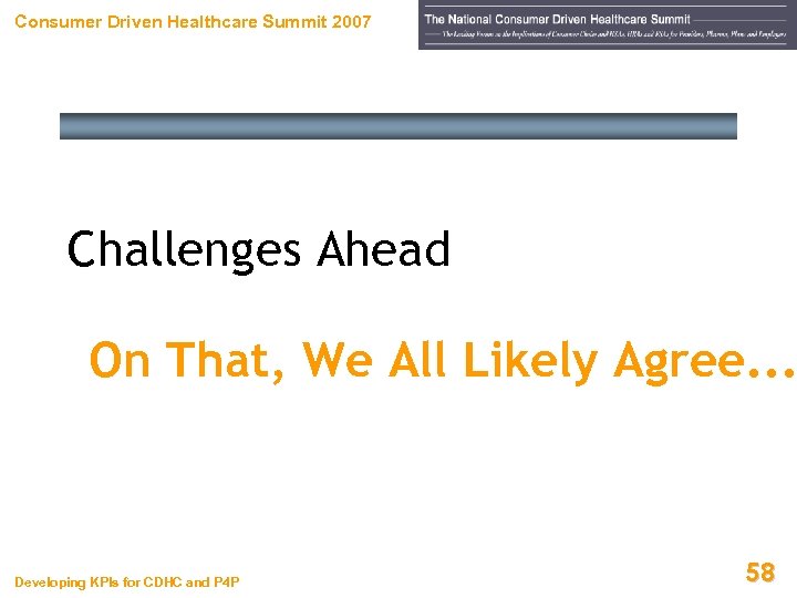 Consumer Driven Healthcare Summit 2007 Challenges Ahead On That, We All Likely Agree. . . Developing KPIs for CDHC and P 4 P 58