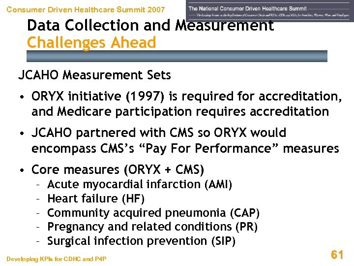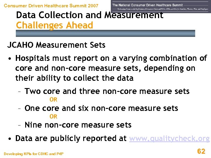 Consumer Driven Healthcare Summit 2007 Data Collection and Measurement Challenges Ahead JCAHO Measurement Sets • ORYX initiative (1997) is required for accreditation, and Medicare participation requires accreditation • JCAHO partnered with CMS so ORYX would encompass CMS’s “Pay For Performance” measures • Core measures (ORYX + CMS) – – – Acute myocardial infarction (AMI) Heart failure (HF) Community acquired pneumonia (CAP) Pregnancy and related conditions (PR) Surgical infection prevention (SIP) Developing KPIs for CDHC and P 4 P 61