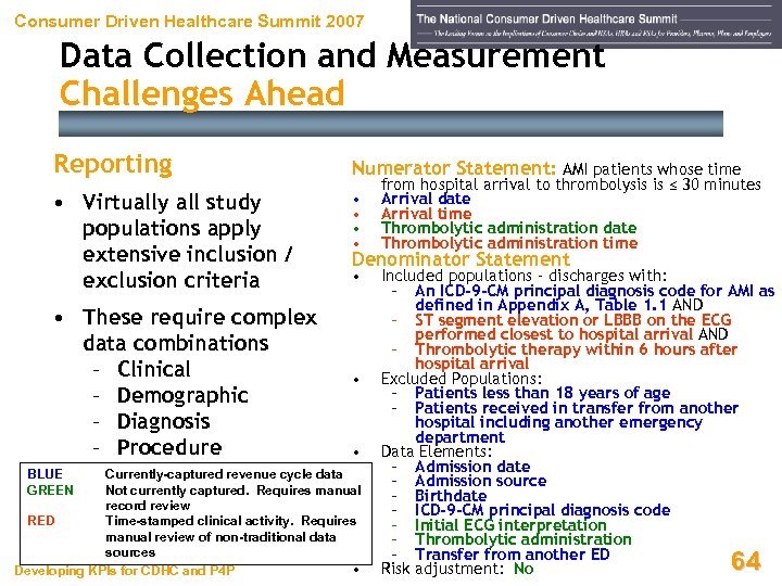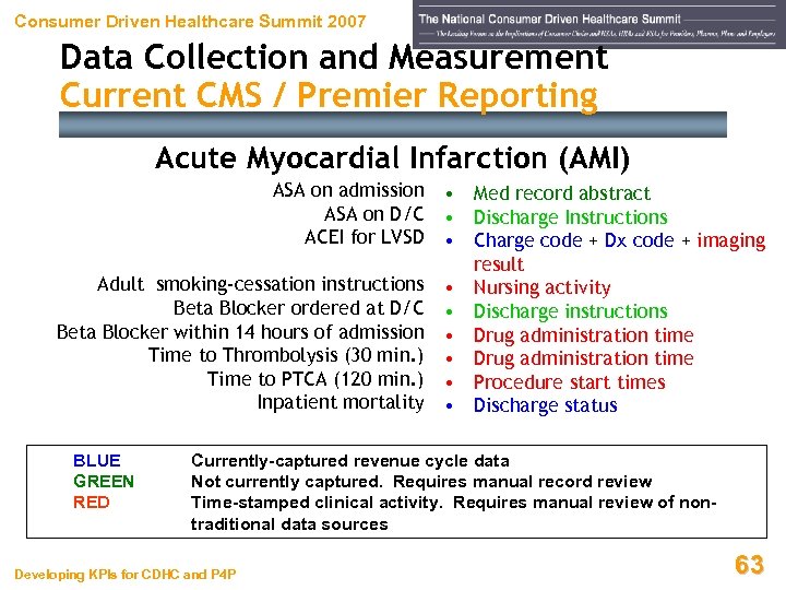 Consumer Driven Healthcare Summit 2007 Data Collection and Measurement Current CMS / Premier Reporting Acute Myocardial Infarction (AMI) ASA on admission ASA on D/C ACEI for LVSD Adult smoking-cessation instructions Beta Blocker ordered at D/C Beta Blocker within 14 hours of admission Time to Thrombolysis (30 min. ) Time to PTCA (120 min. ) Inpatient mortality BLUE GREEN RED • Med record abstract • Discharge Instructions • Charge code + Dx code + imaging result • Nursing activity • Discharge instructions • Drug administration time • Procedure start times • Discharge status Currently-captured revenue cycle data Not currently captured. Requires manual record review Time-stamped clinical activity. Requires manual review of nontraditional data sources Developing KPIs for CDHC and P 4 P 63