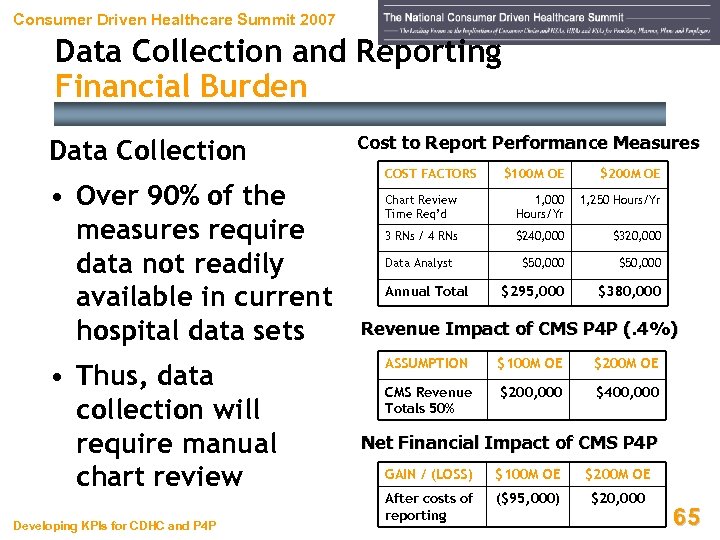 Consumer Driven Healthcare Summit 2007 Data Collection and Reporting Financial Burden Data Collection • Over 90% of the measures require data not readily available in current hospital data sets • Thus, data collection will require manual chart review Developing KPIs for CDHC and P 4 P Cost to Report Performance Measures COST FACTORS $100 M OE $200 M OE Chart Review Time Req’d 1, 000 Hours/Yr 1, 250 Hours/Yr 3 RNs / 4 RNs $240, 000 $320, 000 Data Analyst $50, 000 $295, 000 $380, 000 Annual Total Revenue Impact of CMS P 4 P (. 4%) ASSUMPTION $100 M OE $200 M OE CMS Revenue Totals 50% $200, 000 $400, 000 Net Financial Impact of CMS P 4 P GAIN / (LOSS) $100 M OE $200 M OE After costs of reporting ($95, 000) $20, 000 65