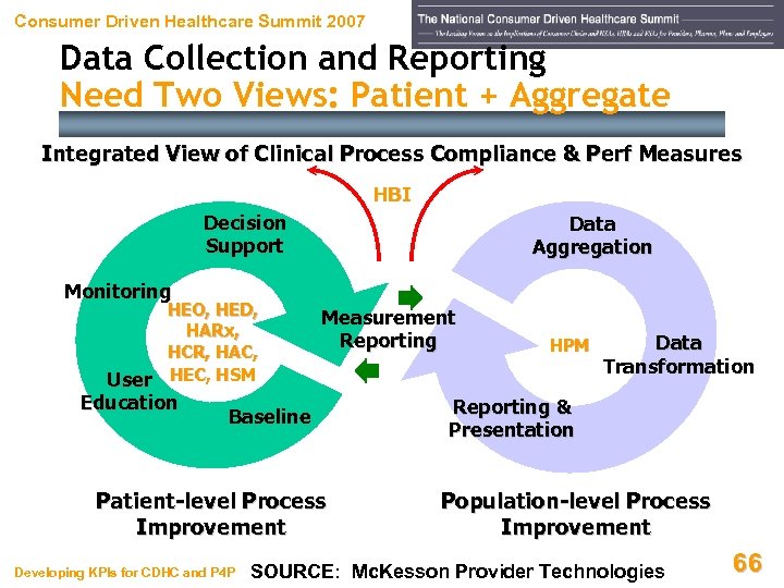 Consumer Driven Healthcare Summit 2007 Data Collection and Reporting Need Two Views: Patient + Aggregate Integrated View of Clinical Process Compliance & Perf Measures HBI Decision Support Data Aggregation Monitoring HEO, HED, HARx, HCR, HAC, User HEC, HSM Education Measurement Reporting Baseline Patient-level Process Improvement Developing KPIs for CDHC and P 4 P HPM Data Transformation Reporting & Presentation Population-level Process Improvement SOURCE: Mc. Kesson Provider Technologies 66