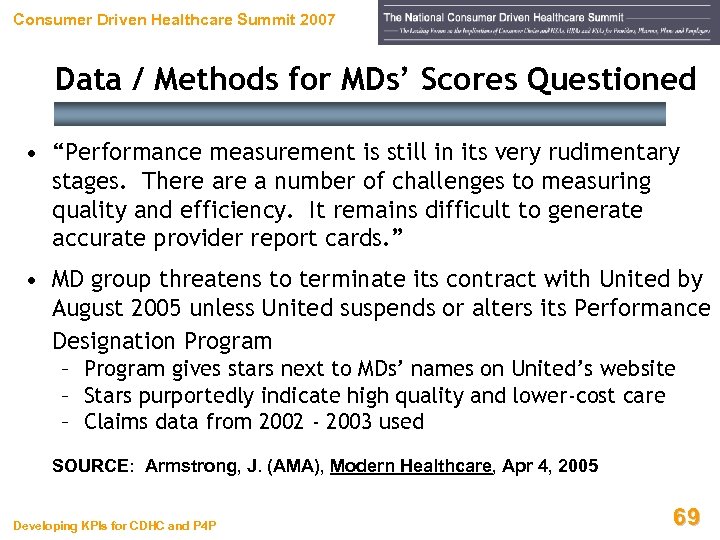 Consumer Driven Healthcare Summit 2007 Pay For Performance Backlash “Too often managers and non-clinical personnel make profound decisions about how we practice medicine. I hope this conference allows us to shape future payment policies in ways that those of us who actually see patients believe will work best. ” Sidna M. Scheitel, MD, MPH Mayo Clinic SOURCE: Outcomes-Based Compensation – Pay-for-Performance Design Principles, 4 th Annual Disease Management Outcomes Summit, Nov 11 -14, 2005 Developing KPIs for CDHC and P 4 P 68