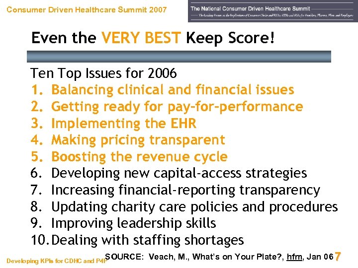 Consumer Driven Healthcare Summit 2007 Even the VERY BEST Keep Score! “In business, words are words, explanations are explanations, promises are promises, but only performance is reality. ” Harold S. Geneen Former President and CEO of ITT Developing KPIs for CDHC and P 4 P 6
