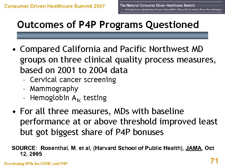 Consumer Driven Healthcare Summit 2007 Data / Methods for MDs’ Scores Questioned • MD group’s concerns: – Only 4 of 1, 144 (0. 3%) of full-time faculty received stars – MDs bill in groups, but United unable to break down claims individually – 40% of MDs ineligible due to of insufficient sample size (not enough claims submitted to analyze) – MDs evaluated on cost, because evidence-based standards for their specialties had not been established SOURCE: Armstrong, J. (AMA), Modern Healthcare, Apr 4, 2005 Developing KPIs for CDHC and P 4 P 70