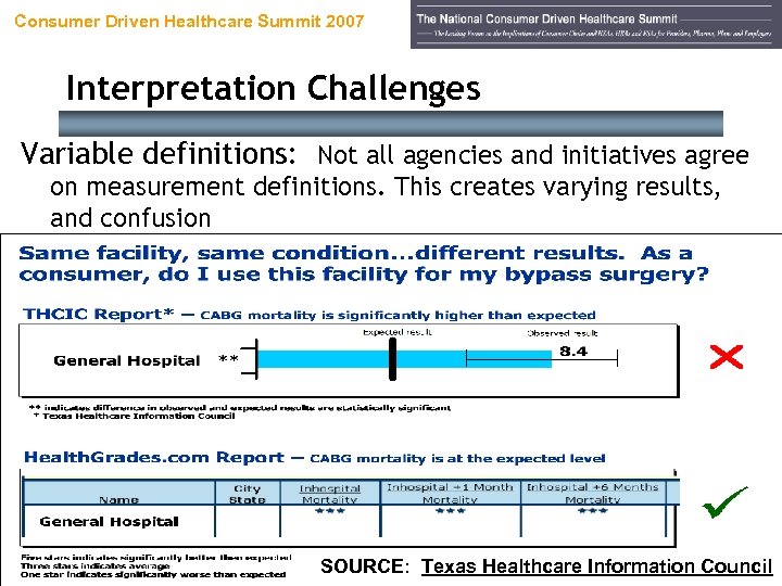 Consumer Driven Healthcare Summit 2007 Interpretation Challenges Variable definitions: Not all agencies and initiatives agree on measurement definitions. This creates varying results, and confusion Developing KPIs for CDHC and P 4 P 72 SOURCE: Texas Healthcare Information Council
