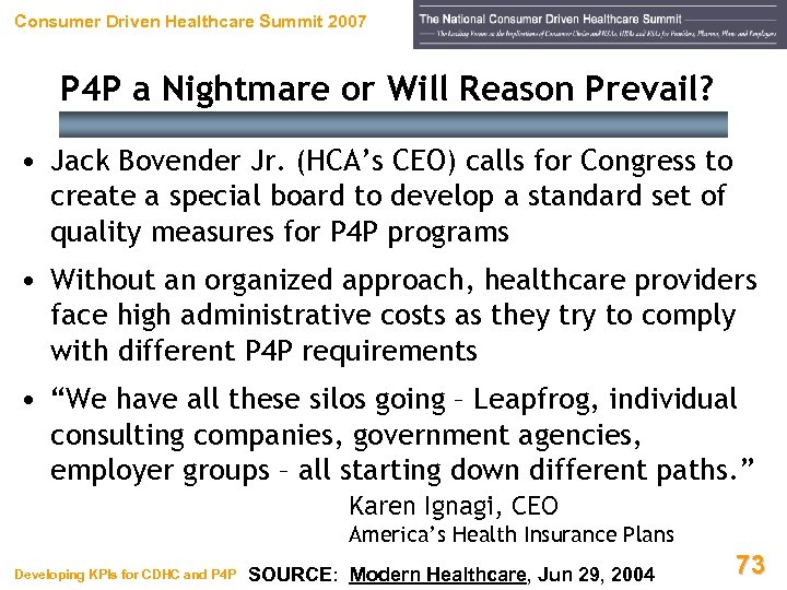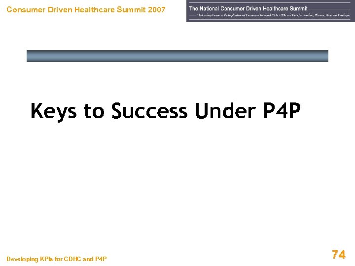 Consumer Driven Healthcare Summit 2007 P 4 P a Nightmare or Will Reason Prevail? • Jack Bovender Jr. (HCA’s CEO) calls for Congress to create a special board to develop a standard set of quality measures for P 4 P programs • Without an organized approach, healthcare providers face high administrative costs as they try to comply with different P 4 P requirements • “We have all these silos going – Leapfrog, individual consulting companies, government agencies, employer groups – all starting down different paths. ” Karen Ignagi, CEO America’s Health Insurance Plans Developing KPIs for CDHC and P 4 P SOURCE: Modern Healthcare, Jun 29, 2004 73