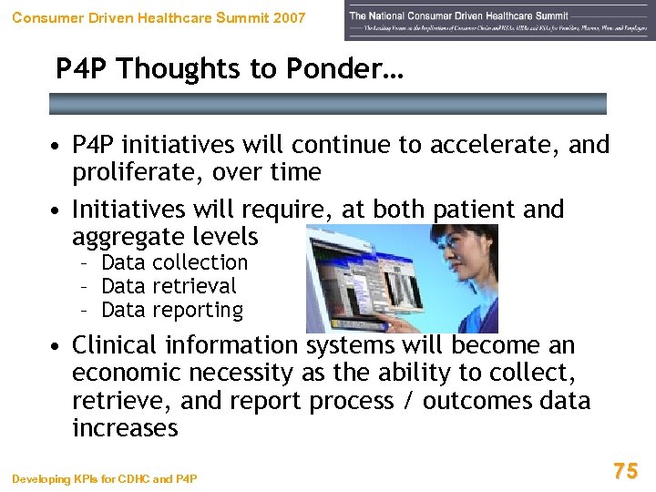 Consumer Driven Healthcare Summit 2007 Keys to Success Under P 4 P Developing KPIs for CDHC and P 4 P 74