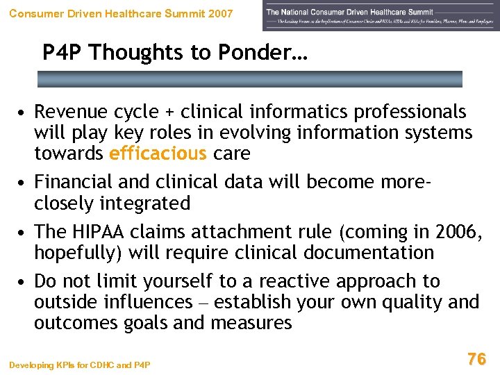 Consumer Driven Healthcare Summit 2007 P 4 P Thoughts to Ponder… • P 4 P initiatives will continue to accelerate, and proliferate, over time • Initiatives will require, at both patient and aggregate levels – Data collection – Data retrieval – Data reporting • Clinical information systems will become an economic necessity as the ability to collect, retrieve, and report process / outcomes data increases Developing KPIs for CDHC and P 4 P 75