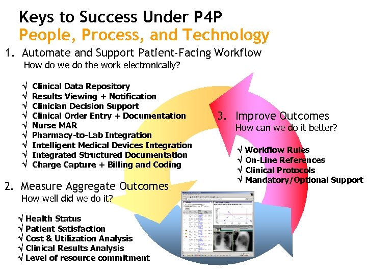 Keys to Success Under P 4 P People, Process, and Technology 1. Automate and Support Patient-Facing Workflow How do we do the work electronically? Clinical Data Repository Results Viewing + Notification Clinician Decision Support Clinical Order Entry + Documentation Nurse MAR Pharmacy-to-Lab Integration Intelligent Medical Devices Integration Integrated Structured Documentation Charge Capture + Billing and Coding 2. Measure Aggregate Outcomes How well did we do it? Health Status Patient Satisfaction Cost & Utilization Analysis Clinical Results Analysis Level of resource commitment 3. Improve Outcomes How can we do it better? Workflow Rules On-Line References Clinical Protocols Mandatory/Optional Support
