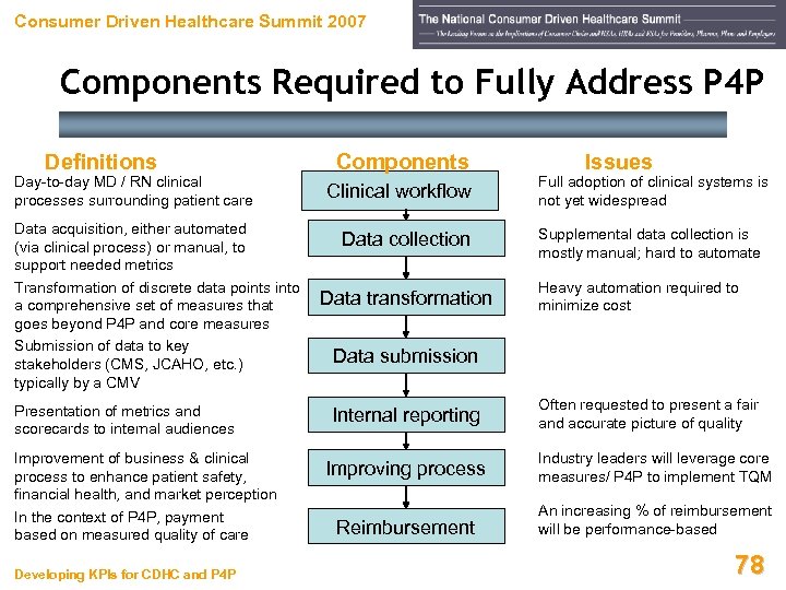 Consumer Driven Healthcare Summit 2007 Components Required to Fully Address P 4 P Definitions Day-to-day MD / RN clinical processes surrounding patient care Data acquisition, either automated (via clinical process) or manual, to support needed metrics Transformation of discrete data points into a comprehensive set of measures that goes beyond P 4 P and core measures Submission of data to key stakeholders (CMS, JCAHO, etc. ) typically by a CMV Presentation of metrics and scorecards to internal audiences Improvement of business & clinical process to enhance patient safety, financial health, and market perception In the context of P 4 P, payment based on measured quality of care Developing KPIs for CDHC and P 4 P Components Clinical workflow Data collection Data transformation Issues Full adoption of clinical systems is not yet widespread Supplemental data collection is mostly manual; hard to automate Heavy automation required to minimize cost Data submission Internal reporting Often requested to present a fair and accurate picture of quality Improving process Industry leaders will leverage core measures/ P 4 P to implement TQM Reimbursement An increasing % of reimbursement will be performance-based 78
