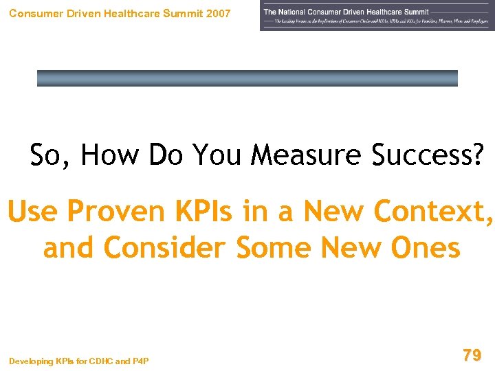 Consumer Driven Healthcare Summit 2007 So, How Do You Measure Success? Use Proven KPIs in a New Context, and Consider Some New Ones Developing KPIs for CDHC and P 4 P 79