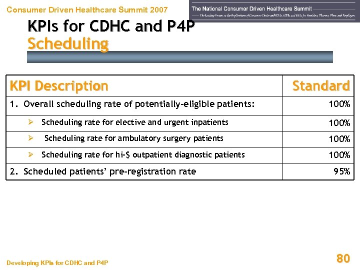 Consumer Driven Healthcare Summit 2007 KPIs for CDHC and P 4 P Scheduling KPI Description 1. Overall scheduling rate of potentially-eligible patients: Ø Scheduling rate for elective and urgent inpatients Standard 100% Scheduling rate for ambulatory surgery patients 100% Ø Scheduling rate for hi-$ outpatient diagnostic patients 100% Ø 2. Scheduled patients’ pre-registration rate Developing KPIs for CDHC and P 4 P 95% 80