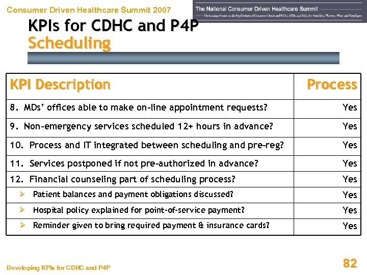 Consumer Driven Healthcare Summit 2007 KPIs for CDHC and P 4 P Scheduling KPI Description Process 1. Use on-line scheduling software house-wide? Yes 2. Have central scheduling unit? Yes 3. Central scheduling answers to Chief Revenue Officer? Yes 4. Surgery uses same scheduling software as other depts? Yes 5. Scheduling system interfaced with registration system? Yes 6. Use on-line OP medical necessity system prior to service? Yes 7. Pre-certification requirements shared with MDs’ offices? Yes Developing KPIs for CDHC and P 4 P 81