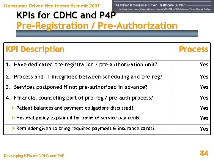 Consumer Driven Healthcare Summit 2007 KPIs for CDHC and P 4 P Pre-Registration / Pre-Authorization KPI Description Standard 1. Overall pre-registration rate of scheduled patients ≥ 95% 2. Overall insurance verification rate of pre-registered patients ≥ 95% 3. Deposit request rate for co-pays and deductibles ≥ 95% 4. Deposit request rate for elective admissions / procedures ≥ 100% 5. Deposit request rate for prior unpaid balances ≥ 95% 6. Data quality compared to pre-established dept standards ≥ 98% Developing KPIs for CDHC and P 4 P 83