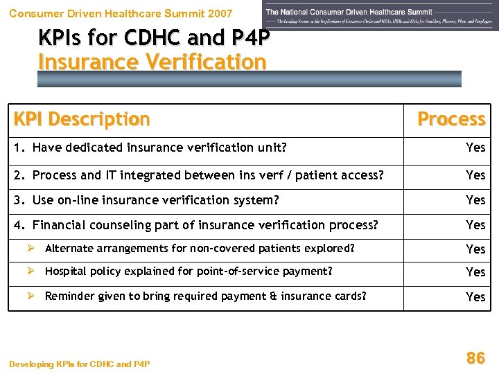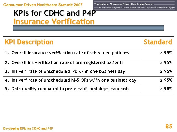 Consumer Driven Healthcare Summit 2007 KPIs for CDHC and P 4 P Insurance Verification KPI Description Standard 1. Overall insurance verification rate of scheduled patients ≥ 95% 2. Overall ins verification rate of pre-registered patients ≥ 95% 3. Ins verf rate of unscheduled IPs w/ in one business day ≥ 95% 4. Ins verf rate of unscheduled hi-$ OPs w/ in one business day ≥ 95% 5. Data quality compared to pre-established dept standards ≥ 98% Developing KPIs for CDHC and P 4 P 85