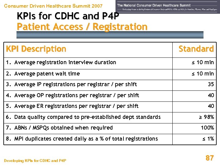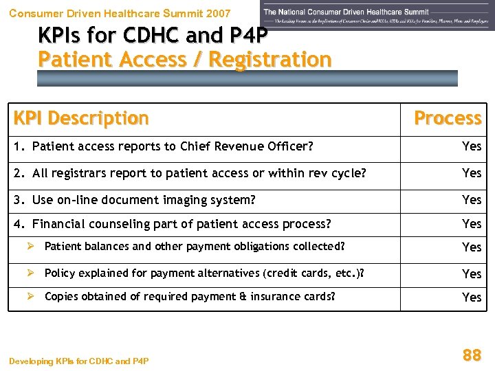 Consumer Driven Healthcare Summit 2007 KPIs for CDHC and P 4 P Patient Access / Registration KPI Description Standard 1. Average registration interview duration ≤ 10 min 2. Average patent wait time ≤ 10 min 3. Average IP registrations per registrar / per shift 35 4. Average OP registrations per registrar / per shift 40 5. Average ER registrations per registrar / per shift 40 6. Data quality compared to pre-established dept standards ≥ 98% 7. ABNs / MSPQs obtained when required 100% 8. MPI duplicates created daily as a % of total registrations ≤ 1% Developing KPIs for CDHC and P 4 P 87