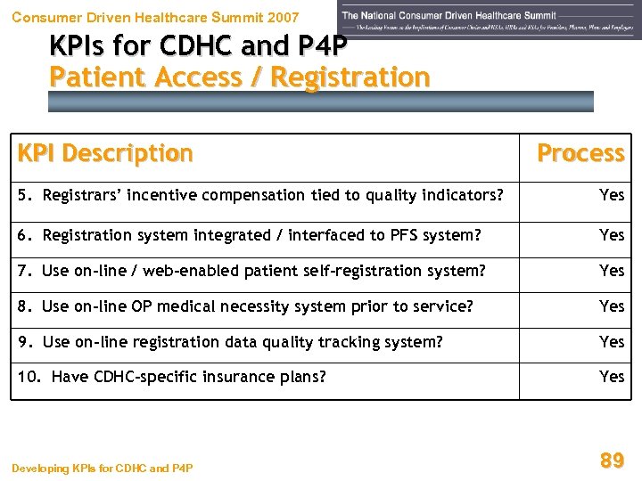 Consumer Driven Healthcare Summit 2007 KPIs for CDHC and P 4 P Patient Access / Registration KPI Description Process 1. Patient access reports to Chief Revenue Officer? Yes 2. All registrars report to patient access or within rev cycle? Yes 3. Use on-line document imaging system? Yes 4. Financial counseling part of patient access process? Yes Ø Patient balances and other payment obligations collected? Yes Ø Policy explained for payment alternatives (credit cards, etc. )? Yes Ø Copies obtained of required payment & insurance cards? Yes Developing KPIs for CDHC and P 4 P 88
