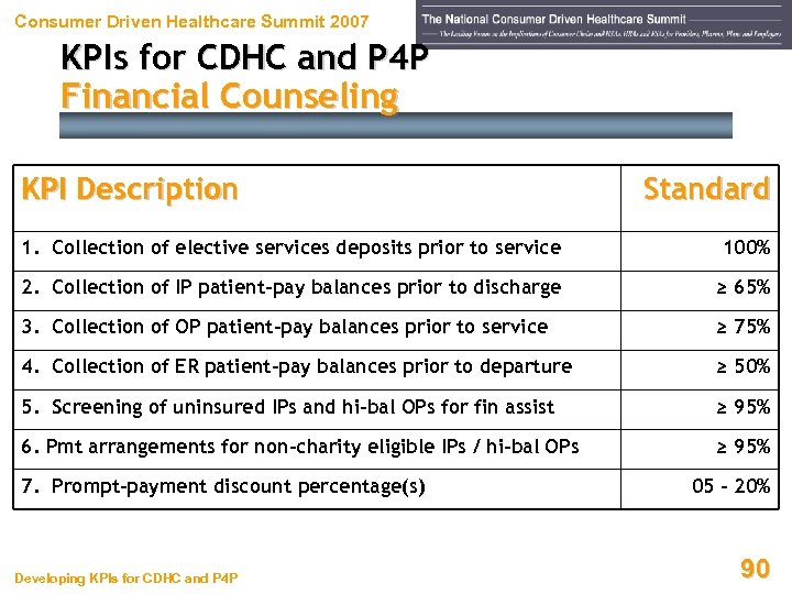 Consumer Driven Healthcare Summit 2007 KPIs for CDHC and P 4 P Financial Counseling KPI Description Standard 1. Collection of elective services deposits prior to service 100% 2. Collection of IP patient-pay balances prior to discharge ≥ 65% 3. Collection of OP patient-pay balances prior to service ≥ 75% 4. Collection of ER patient-pay balances prior to departure ≥ 50% 5. Screening of uninsured IPs and hi-bal OPs for fin assist ≥ 95% 6. Pmt arrangements for non-charity eligible IPs / hi-bal OPs ≥ 95% 7. Prompt-payment discount percentage(s) Developing KPIs for CDHC and P 4 P 05 – 20% 90