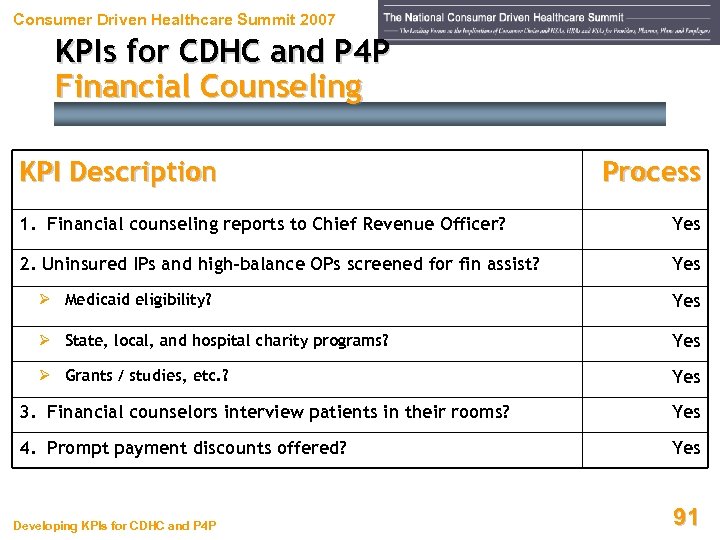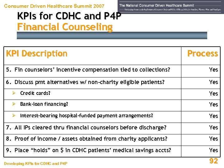 Consumer Driven Healthcare Summit 2007 KPIs for CDHC and P 4 P Financial Counseling KPI Description Process 1. Financial counseling reports to Chief Revenue Officer? Yes 2. Uninsured IPs and high-balance OPs screened for fin assist? Yes Ø Medicaid eligibility? Yes Ø State, local, and hospital charity programs? Yes Ø Grants / studies, etc. ? Yes 3. Financial counselors interview patients in their rooms? Yes 4. Prompt payment discounts offered? Yes Developing KPIs for CDHC and P 4 P 91