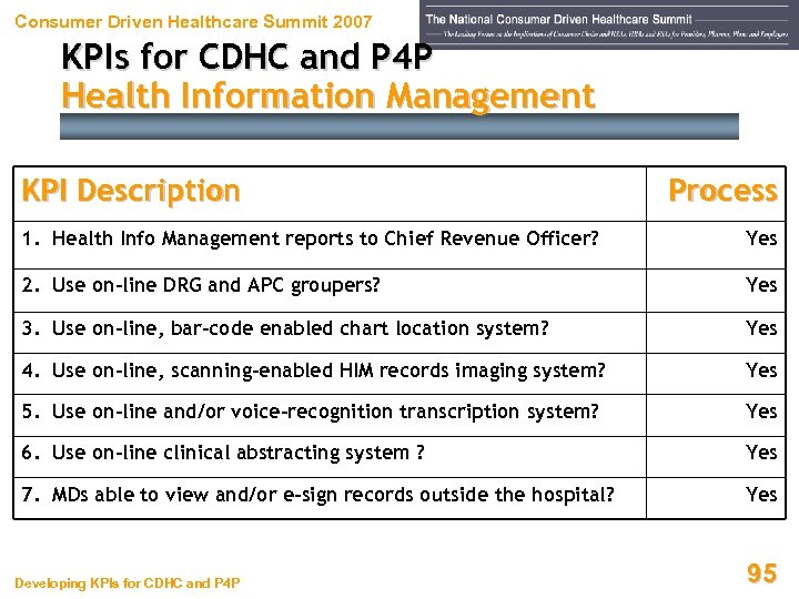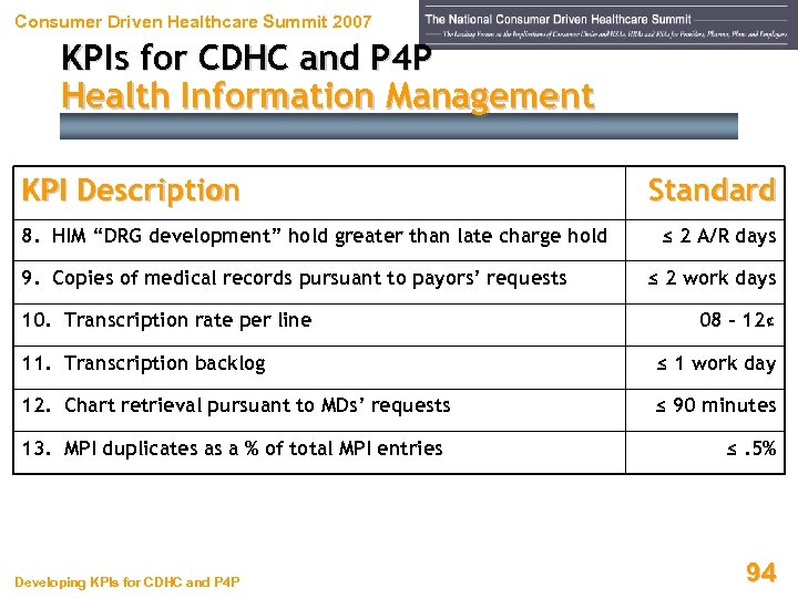 Consumer Driven Healthcare Summit 2007 KPIs for CDHC and P 4 P Health Information Management KPI Description 8. HIM “DRG development” hold greater than late charge hold 9. Copies of medical records pursuant to payors’ requests 10. Transcription rate per line Standard ≤ 2 A/R days ≤ 2 work days 08 – 12¢ 11. Transcription backlog ≤ 1 work day 12. Chart retrieval pursuant to MDs’ requests ≤ 90 minutes 13. MPI duplicates as a % of total MPI entries Developing KPIs for CDHC and P 4 P ≤. 5% 94