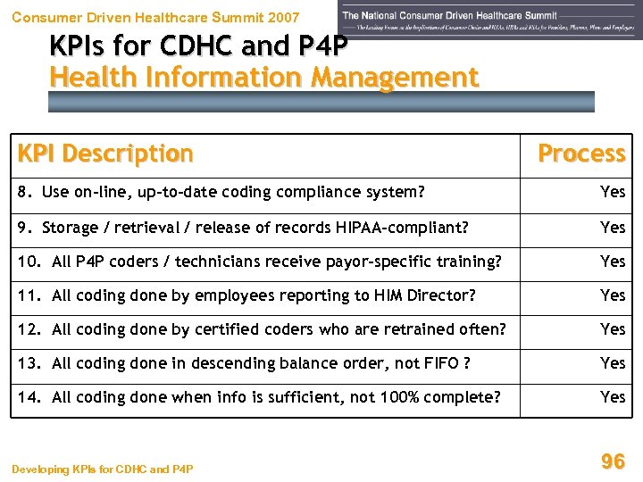 Consumer Driven Healthcare Summit 2007 KPIs for CDHC and P 4 P Health Information Management KPI Description Process 1. Health Info Management reports to Chief Revenue Officer? Yes 2. Use on-line DRG and APC groupers? Yes 3. Use on-line, bar-code enabled chart location system? Yes 4. Use on-line, scanning-enabled HIM records imaging system? Yes 5. Use on-line and/or voice-recognition transcription system? Yes 6. Use on-line clinical abstracting system ? Yes 7. MDs able to view and/or e-sign records outside the hospital? Yes Developing KPIs for CDHC and P 4 P 95