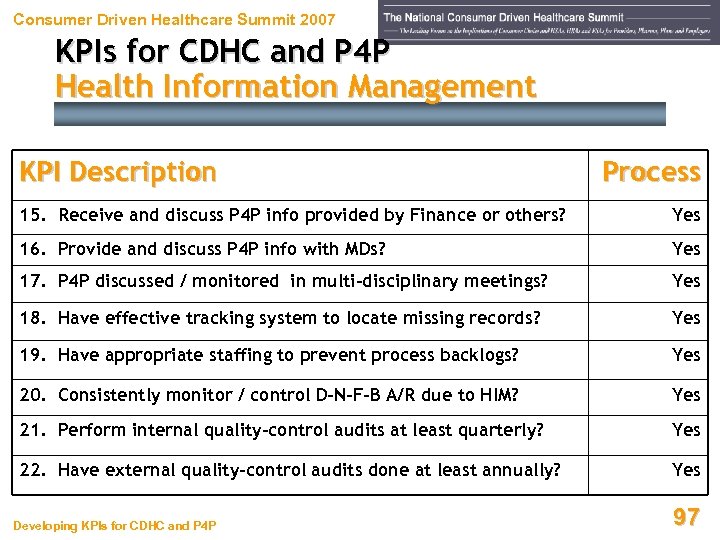Consumer Driven Healthcare Summit 2007 KPIs for CDHC and P 4 P Health Information Management KPI Description Process 8. Use on-line, up-to-date coding compliance system? Yes 9. Storage / retrieval / release of records HIPAA-compliant? Yes 10. All P 4 P coders / technicians receive payor-specific training? Yes 11. All coding done by employees reporting to HIM Director? Yes 12. All coding done by certified coders who are retrained often? Yes 13. All coding done in descending balance order, not FIFO ? Yes 14. All coding done when info is sufficient, not 100% complete? Yes Developing KPIs for CDHC and P 4 P 96