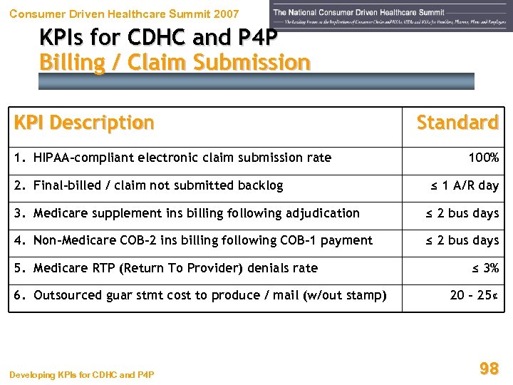 Consumer Driven Healthcare Summit 2007 KPIs for CDHC and P 4 P Billing / Claim Submission KPI Description 1. HIPAA-compliant electronic claim submission rate 2. Final-billed / claim not submitted backlog Standard 100% ≤ 1 A/R day 3. Medicare supplement ins billing following adjudication ≤ 2 bus days 4. Non-Medicare COB-2 ins billing following COB-1 payment ≤ 2 bus days 5. Medicare RTP (Return To Provider) denials rate 6. Outsourced guar stmt cost to produce / mail (w/out stamp) Developing KPIs for CDHC and P 4 P ≤ 3% 20 - 25¢ 98