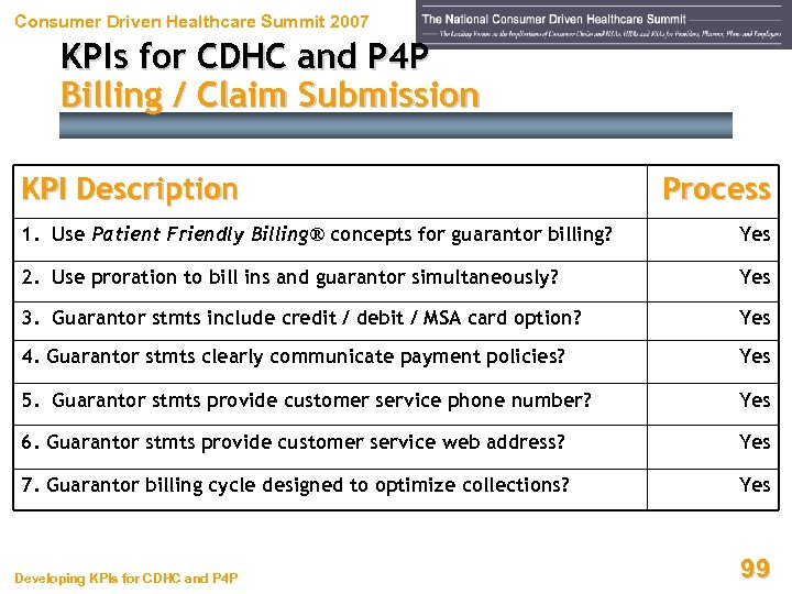 Consumer Driven Healthcare Summit 2007 KPIs for CDHC and P 4 P Billing / Claim Submission KPI Description Process 1. Use Patient Friendly Billing® concepts for guarantor billing? Yes 2. Use proration to bill ins and guarantor simultaneously? Yes 3. Guarantor stmts include credit / debit / MSA card option? Yes 4. Guarantor stmts clearly communicate payment policies? Yes 5. Guarantor stmts provide customer service phone number? Yes 6. Guarantor stmts provide customer service web address? Yes 7. Guarantor billing cycle designed to optimize collections? Yes Developing KPIs for CDHC and P 4 P 99