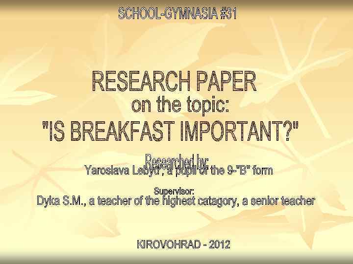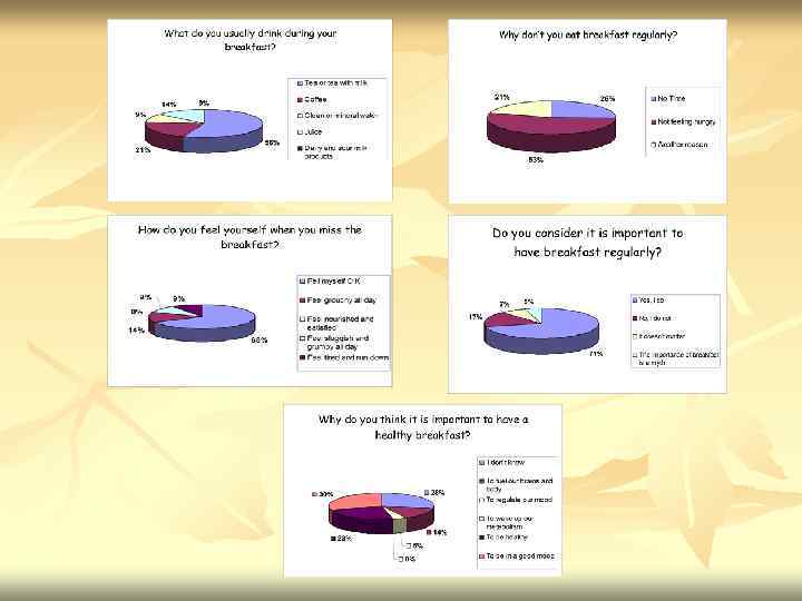 I. Introduction The famous English saying implies ‘Eat breakfast like a King, lunch like a princess and tea like a poor man’. Some of us fully follow it. They consider that breakfast is the most important meal of the day. The others don’t agree with the importance of breakfast and try to skip eating breakfast in different reasons. Is breakfast really the most important meal of the day? Or is it all just a myth? How to build a better and healthier breakfast? These questions are being discussed from far a long time and are actual till nowadays. Thus, according to 47 observational studies on breakfast habits, carried out in Europe and the US during the latest years, about 10 -30% of children and adolescents regularly skip breakfast. This detrimental practice progressively increases from childhood to adulthood. The contemporary data from Ukraine indicate that this issue concerns Ukraine as well. Although 90% of the population declares that they usually have breakfast, only 30% eat a quantitatively and qualitatively appropriate meal at the beginning of the day. Every morning, most of people just drink a cup of coffee or tea. There is an increasing trend towards standing up and hurried breakfast, eaten at home, with little attention paid to the meal composition. A subsequent analysis, made by Eurisko in 2007, confirms these data and characterized habits, lack of time, and lack of appetite as the main courses for passing over breakfast. In this paper I try to answer the abovementioned questions and to investigate the attitude toward this issue of my classmates and schoolmates, to analyze how it is connected with their study and state of their health and to study recommendations of specialists on building a better breakfast. So, the main aim of my paper is to prepare consensus information on the importance of breakfast, based on resent scientific evidence and on my own investigation among my classmates and friends, and in such a way show the role of breakfast in the attainment and maintenance of health and wellness.
