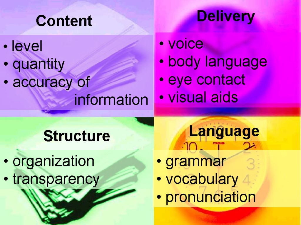 Content level quantity accuracy of information Structure organization Скачать презентацию Content level quantity accuracy of information Structure organization 4_main_aspects_of_presentation.ppt Количество слайдов: 1 Content level quantity accuracy of information Structure organization transparency Delivery voice body language eye contact visual aids Language grammar vocabulary pronunciation