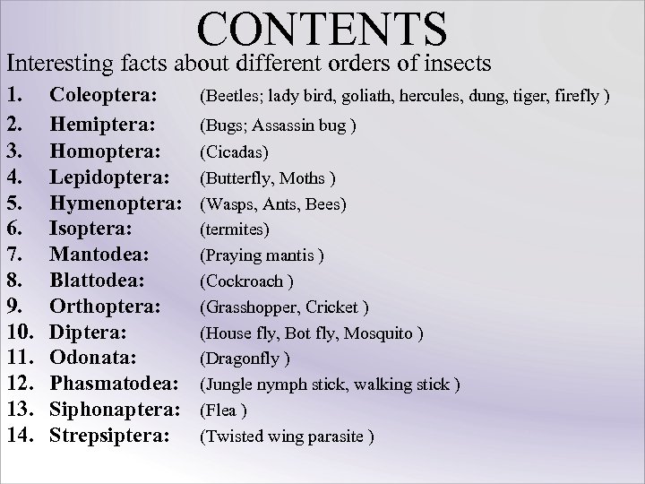 CONTENTS Interesting facts about different orders of insects 1. 2. 3. 4. 5. 6. 7. 8. 9. 10. 11. 12. 13. 14. Coleoptera: Hemiptera: Homoptera: Lepidoptera: Hymenoptera: Isoptera: Mantodea: Blattodea: Orthoptera: Diptera: Odonata: Phasmatodea: Siphonaptera: Strepsiptera: (Beetles; lady bird, goliath, hercules, dung, tiger, firefly ) (Bugs; Assassin bug ) (Cicadas) (Butterfly, Moths ) (Wasps, Ants, Bees) (termites) (Praying mantis ) (Cockroach ) (Grasshopper, Cricket ) (House fly, Bot fly, Mosquito ) (Dragonfly ) (Jungle nymph stick, walking stick ) (Flea ) (Twisted wing parasite )