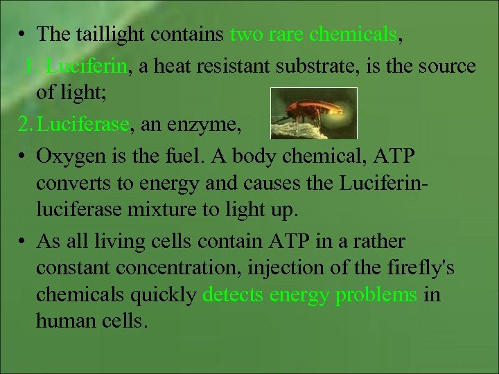 • The taillight contains two rare chemicals, 1. Luciferin, a heat resistant substrate, is the source of light; 2. Luciferase, an enzyme, • Oxygen is the fuel. A body chemical, ATP converts to energy and causes the Luciferinluciferase mixture to light up. • As all living cells contain ATP in a rather constant concentration, injection of the firefly's chemicals quickly detects energy problems in human cells.