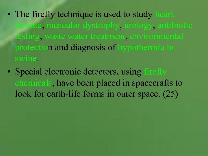 • The firefly technique is used to study heart disease, muscular dystrophy, urology, antibiotic testing, waste water treatment, environmental protection and diagnosis of hypothermia in swine. • Special electronic detectors, using firefly chemicals, have been placed in spacecrafts to look for earth-life forms in outer space. (25)