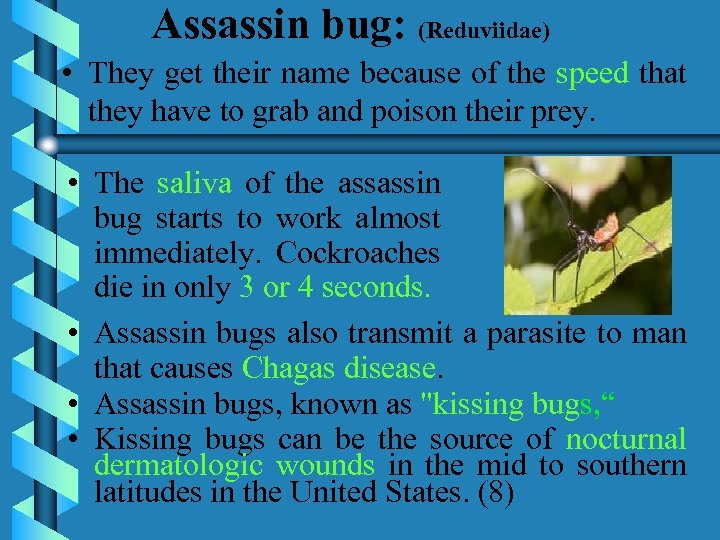 Assassin bug: (Reduviidae) • They get their name because of the speed that they have to grab and poison their prey. • The saliva of the assassin bug starts to work almost immediately. Cockroaches die in only 3 or 4 seconds. • Assassin bugs also transmit a parasite to man that causes Chagas disease. • Assassin bugs, known as "kissing bugs, “ • Kissing bugs can be the source of nocturnal dermatologic wounds in the mid to southern latitudes in the United States. (8)