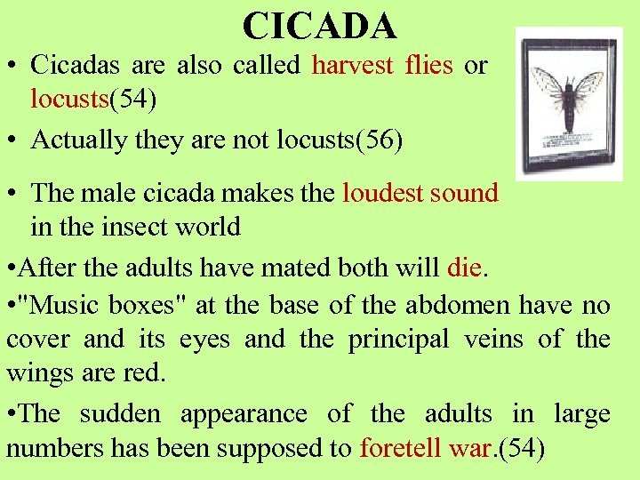 CICADA • Cicadas are also called harvest flies or locusts(54) • Actually they are not locusts(56) • The male cicada makes the loudest sound in the insect world • After the adults have mated both will die. • "Music boxes" at the base of the abdomen have no cover and its eyes and the principal veins of the wings are red. • The sudden appearance of the adults in large numbers has been supposed to foretell war. (54)