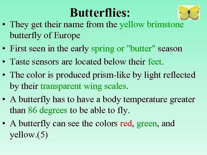 Butterflies: • They get their name from the yellow brimstone butterfly of Europe • First seen in the early spring or "butter" season • Taste sensors are located below their feet. • The color is produced prism-like by light reflected by their transparent wing scales. • A butterfly has to have a body temperature greater than 86 degrees to be able to fly. • A butterfly can see the colors red, green, and yellow. (5)